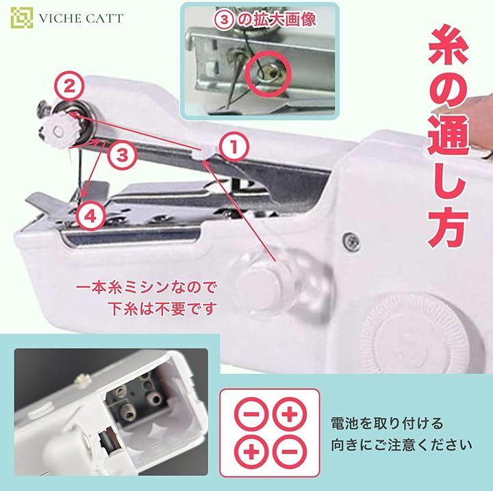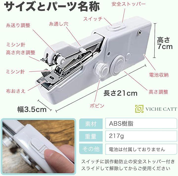 「素材」ABS樹脂「サイズ」長さ21cmx高さ7cmx幅3.5cm「重量」217g「カラー」ホワイト「選べる2タイプ」(1)ハンドミシン単品/(2)ハンドミシン+ソーイングセット(ポーチ仕様)「本体の付属品」ボビンx2、ミシン針x1、糸通しx1、延長ロッドx1((1)(2)どちらにも付属します)「電源」単三乾電池x4本(電池は付属していません。