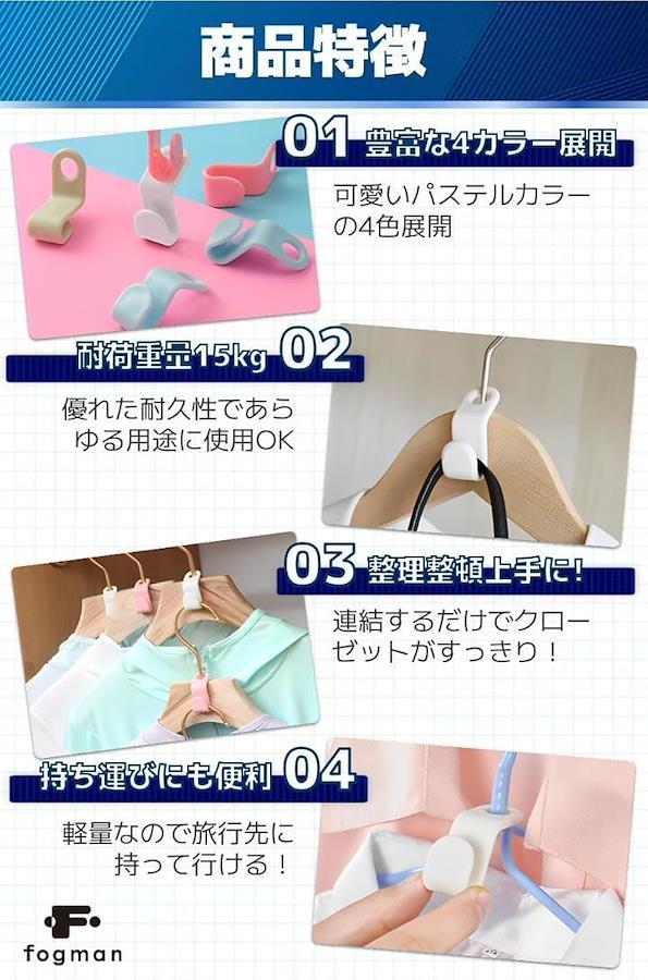 「商品特徴」(1)豊富な4カラー展開:可愛いパステルカラーの4色展開/(2)耐荷重量15kg:優れた耐久性であらゆる用途に使用OK/(3)整理整頓上手に.:連結するだけでクローゼットがすっきり。/(4)持ち運びにも便利:軽量なので旅行先に持って行ける。