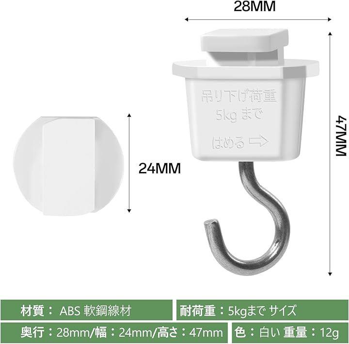 3、材質: ABS、軟鋼線材 耐荷重:5kgまで サイズ:奥行:28mm/幅:24mm/高さ:47mm 色:白い 重量:12g。