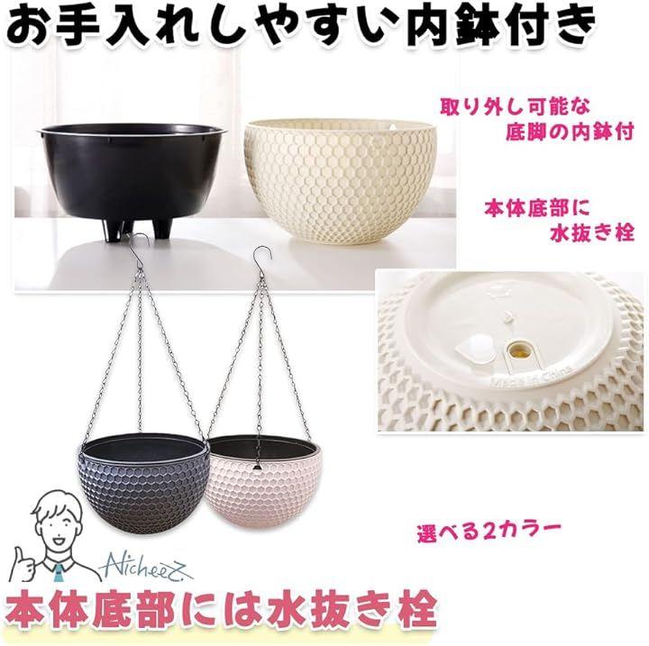 「商品内容」ハンキングバスケット(2個セット) 材質:樹脂 カラー:オフホワイト/ダークグレー サイズ:上部直径/約16.5cm底部直径/約7.8cm 深さ/約11cm チェーン長さ/約46cm