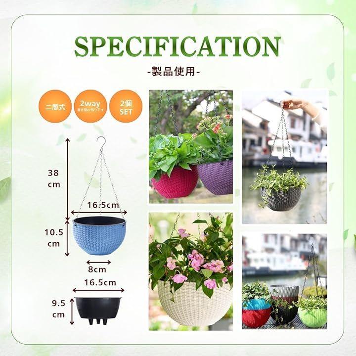 「商品詳細」 <内容>:ハンギングプランター 2個セット <構造>:二重構造(脚付き内側プランター付き) <サイズ>:チェーン長さ 約38cm/プランター高さ 約10.5cm/上部直径 約16.5cm/底部直径 約8cm <内側>プランターサイズ:約9.5cm x 16.5cm <仕様>:チェーン取り外し可能、吊り下げ・置き型両対応 *インテリア性と実用性を兼ね備えたプランターです。
