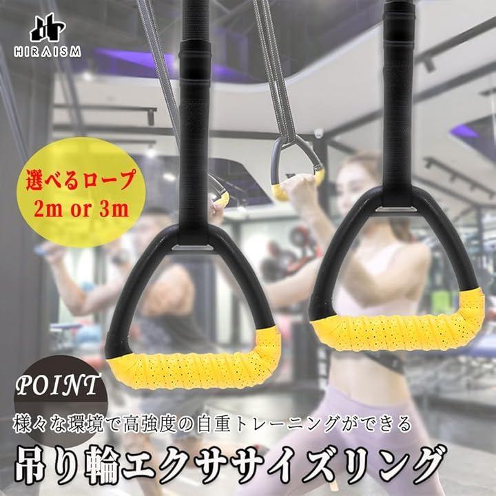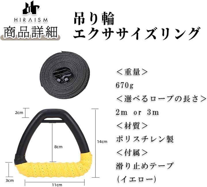 「商品内容」吊り輪エクササイズリング <サイズ>商品詳細をご参照ください <重量>670g <選べるロープの長さ>2m or 3m <ストラップ幅>2.5cm <材質>ポリスチレン製 <付属>滑り止めテープ(イエロー)