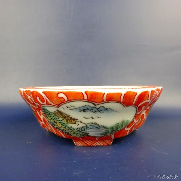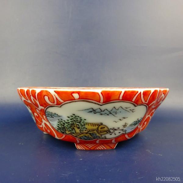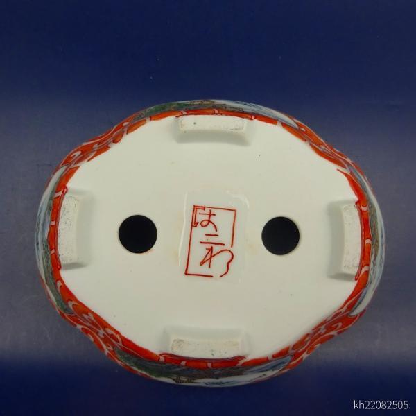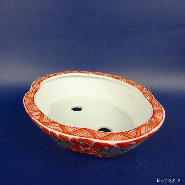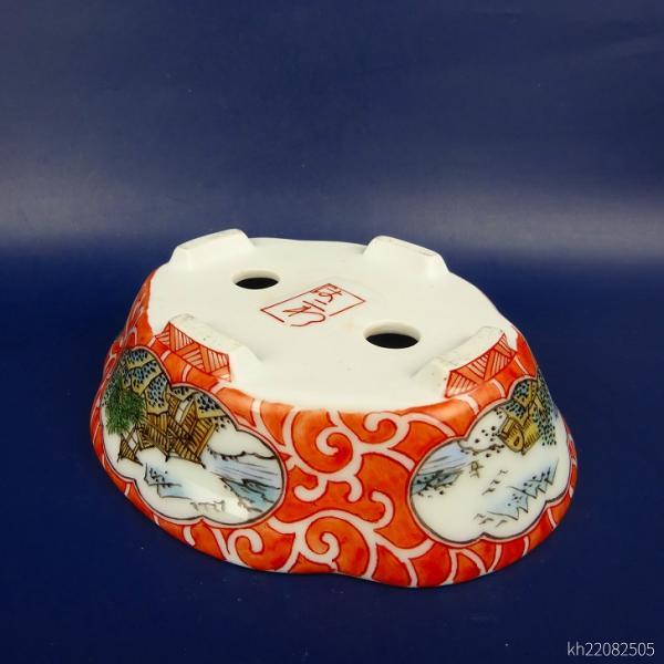 Haniwa original small bonsai pot, approximately 15.5cm long, featuring a quince flower and landscape painting. Brand new.