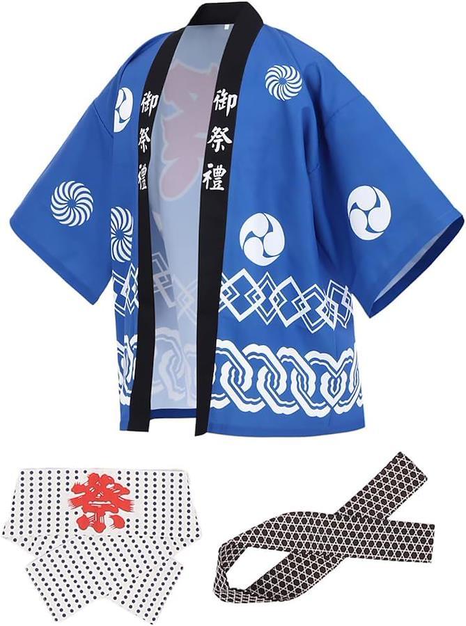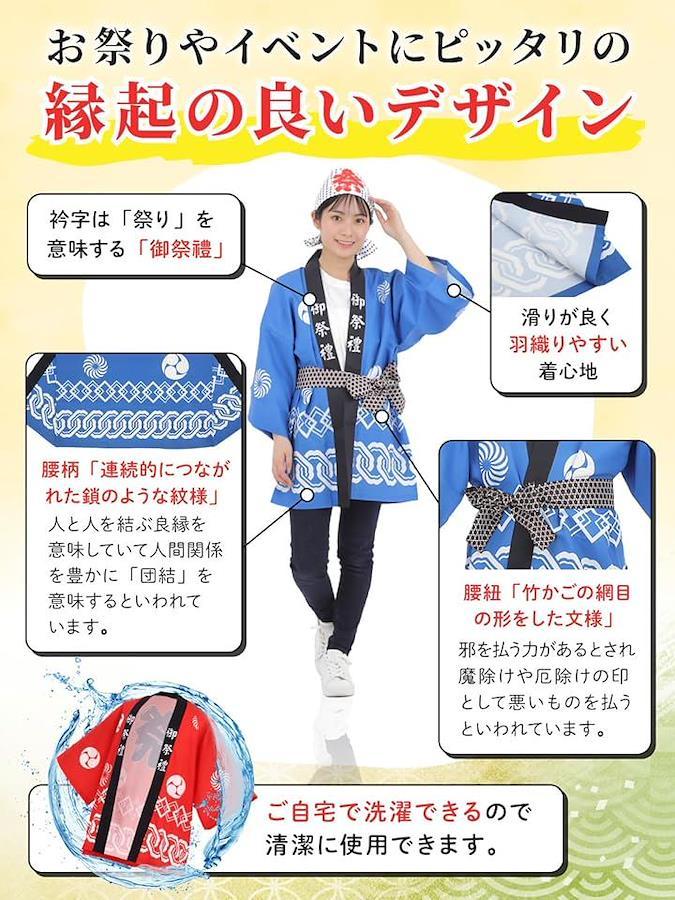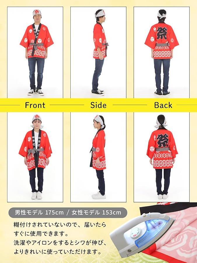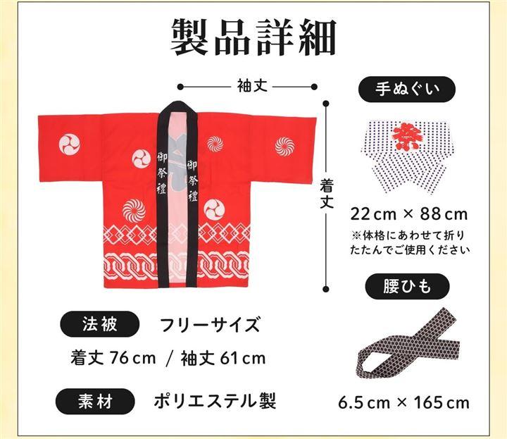 「サイズ」法被:着丈76cm、袖丈61cm 手ぬぐい:22x88cm 腰ひも:6.5x165cm 素材:ポリエステル製