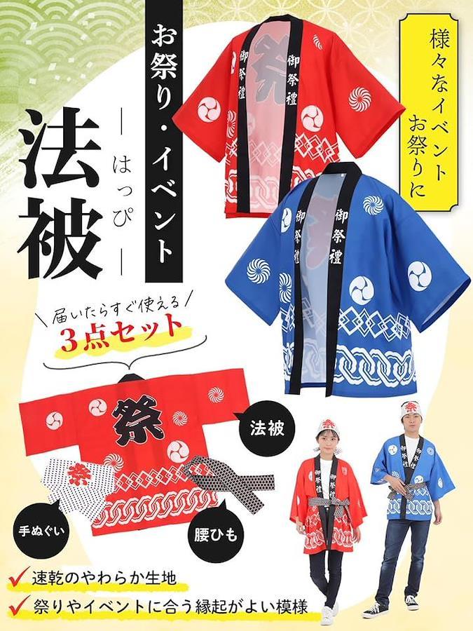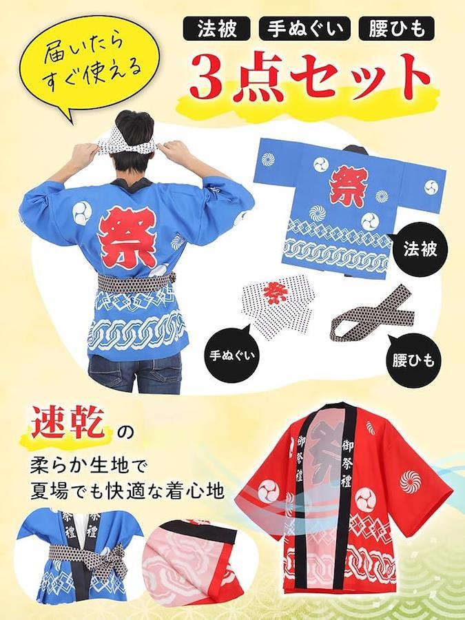 「法被3点セット」届いたらすぐ使える法被、手ぬぐい、腰ひもの3点セット。