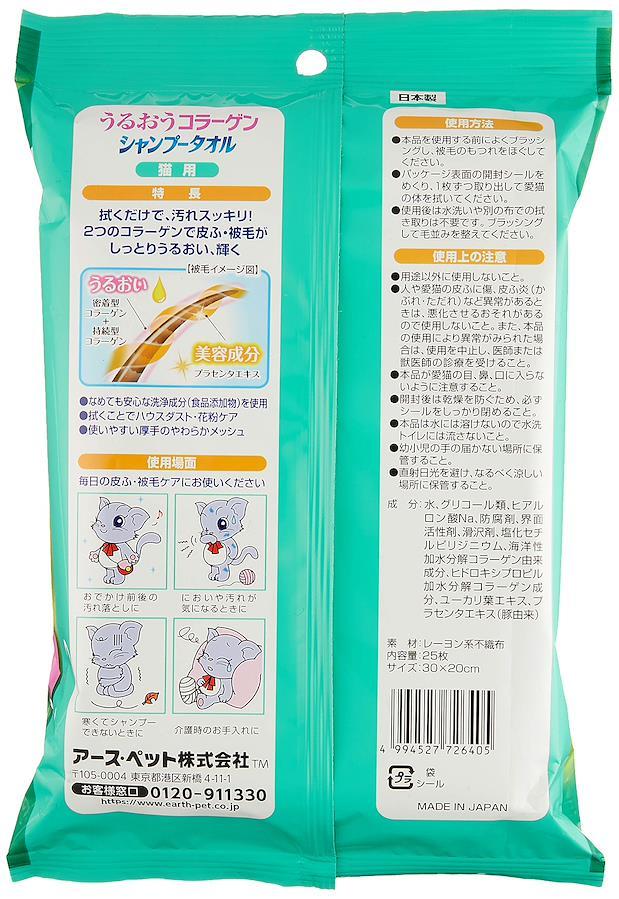 シャンプー液が汚れをふき取ります。ヒアルロン酸と植物エキスが皮膚被毛に潤いを与え、拭く事でハウスダスト・花粉から愛猫を守ります。