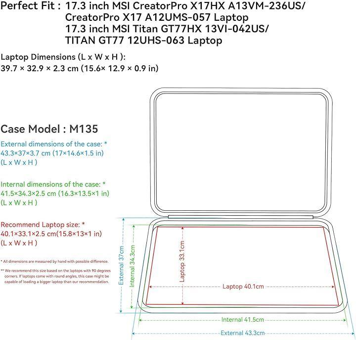 「モデル番号 : M135」ケースの外寸: 43.3x37.0x3.7cm(17.0x14.6x1.5インチ)、ケースの内寸: 41.5x34.3x2.5cm (16.3x13.5x1.0インチ)。