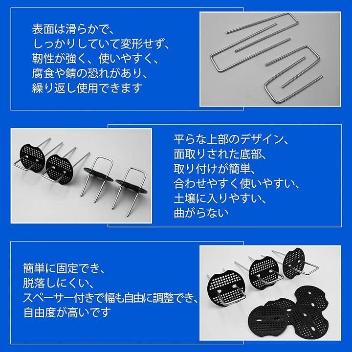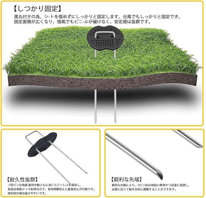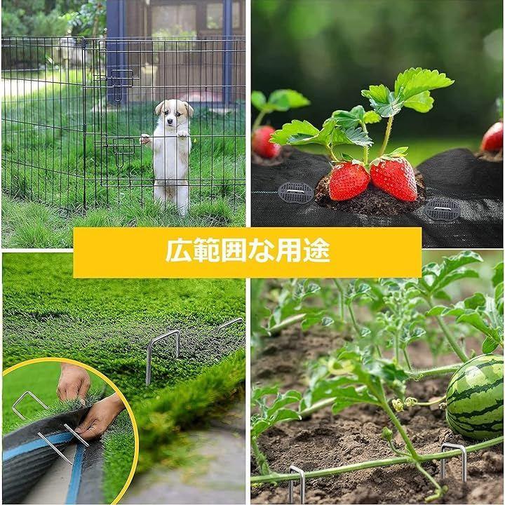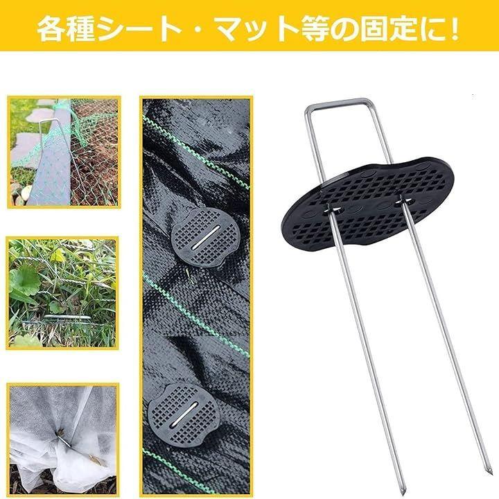 防草シート、人工芝、農業用防虫ネット、不織布、ビニールマルチ、各種シート・マット等を地面に設置・固定できるU字型ピンの商品です。