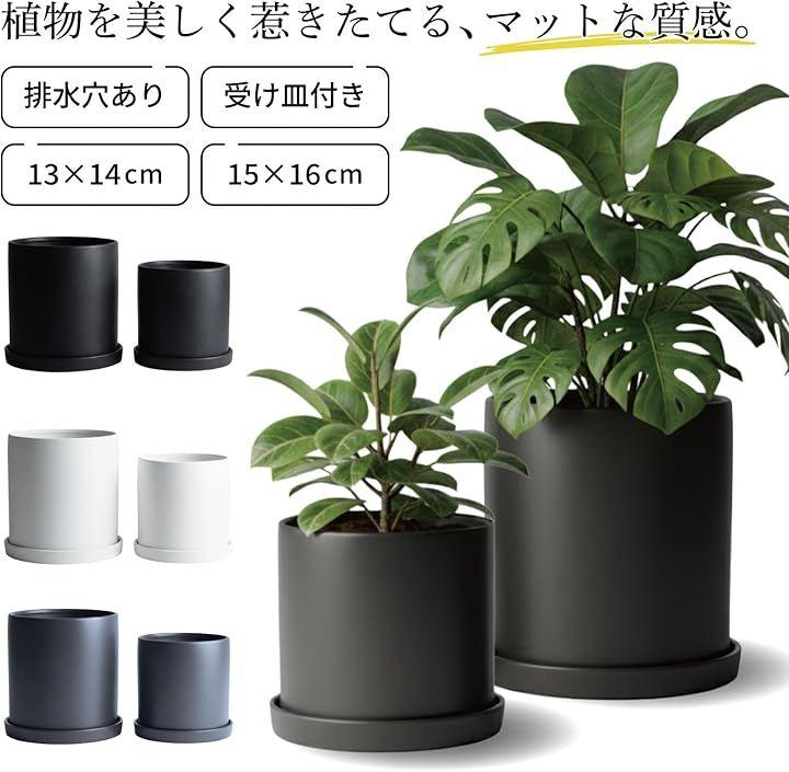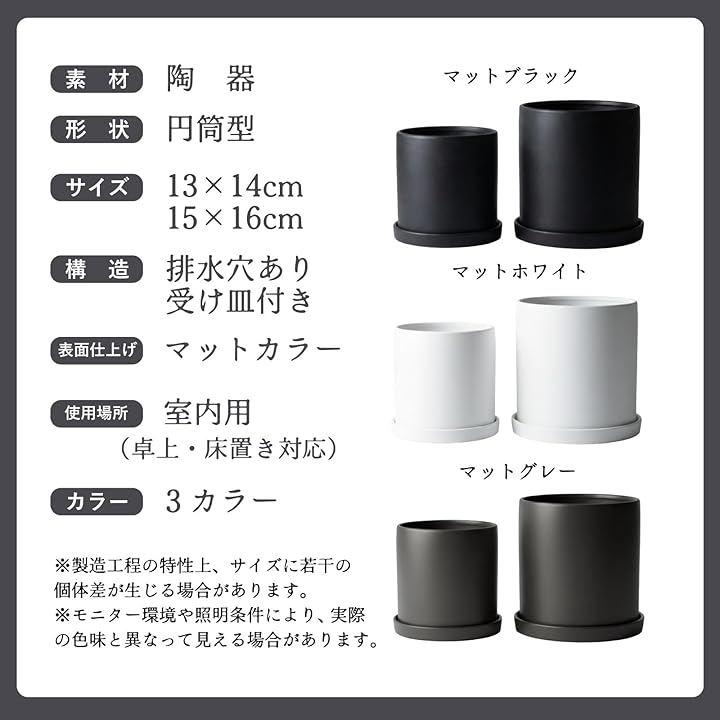 「素材」陶器 「表面仕上げ」マットカラー 「形状」円筒型 「構造」排水穴あり/受け皿付き 「サイズ」13x14cm、15x16cm 「カラー」マットホワイト、マットブラック、マットグレー 「使用場所」室内用(卓上・床置き対応) *製造工程の特性上、サイズに若干の個体差が生じる場合があります。