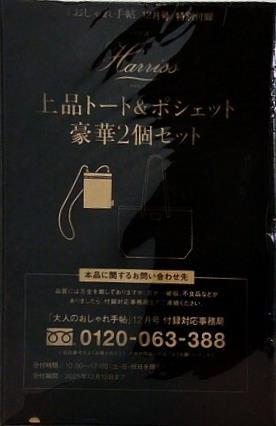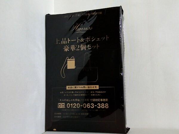 JAN等:商品名:Harriss 上品トート&ポシェット豪華2個セット 大人のおしゃれ手帖 2025年 12月号 特別付録属性:本詳細:状態:未開封品その他:圧縮可。この商品は出荷時にメール便系の3辺規格内へ収めるために、一旦開封したり、外箱等を破棄して中身のみを発送する場合があります。また圧縮にて若干型崩する場合もございます。