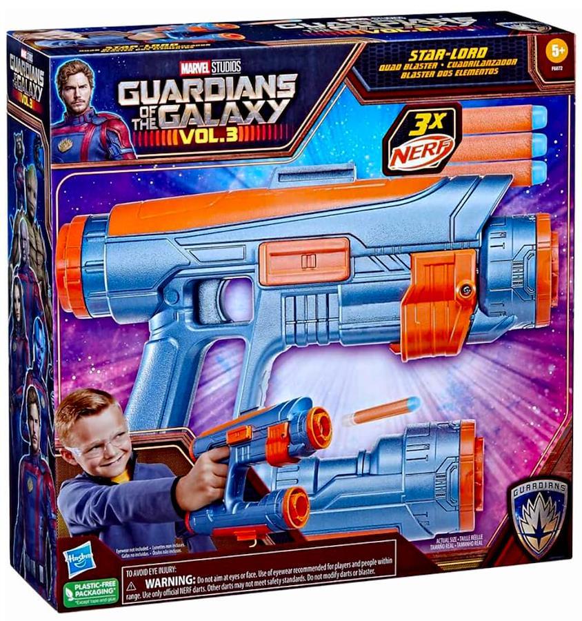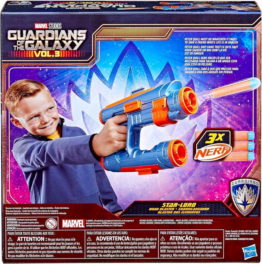 ★「ガーディアンズ オブ ギャラクシー」シリーズより、”伝説の”スターロードが愛用するブラスターがナーフ銃として登場!!やわらかスポンジタイプのNERF弾3発が付属します。