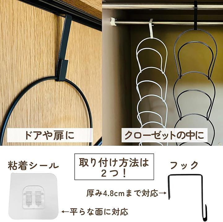 ドアや扉、ポールハンガーなどにひっかける吊り下げフックと、壁などに貼り付ける粘着シールを付属。
