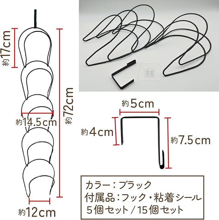 15個セット:帽子掛けハンガー本体15個、吊り下げドアフック3個、粘着シール3個。