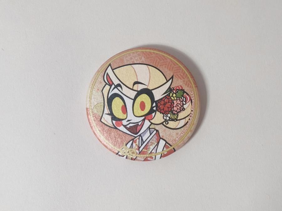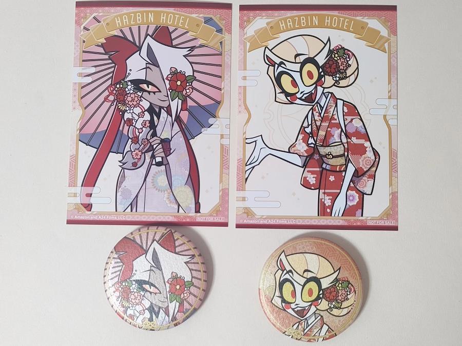 This limited-edition set includes two can badges and two bromide-style cards.A must-have collectible item for Hazbin Hotel fans who love rare Japan-only merchandise!