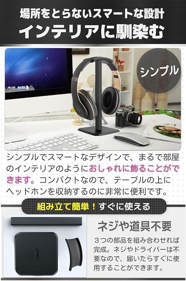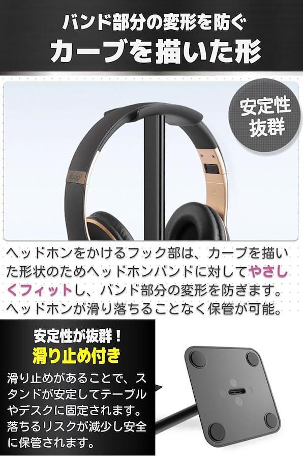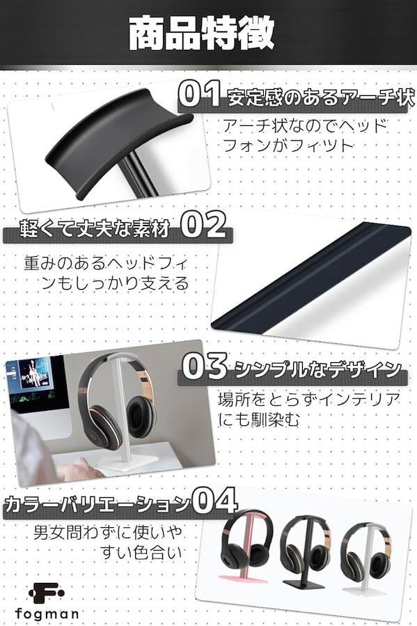「商品特徴」(1)安定感のあるアーチ状:アーチ状なのでヘッドフォンがフィツト/(2)軽くて丈夫な素材:重みのあるヘッドフィンもしっかり支える/(3)シンプルなデザイン:場所をとらずインテリアにも馴染む/(4)カラーバリエーション:男女問わずに使いやすい色合い