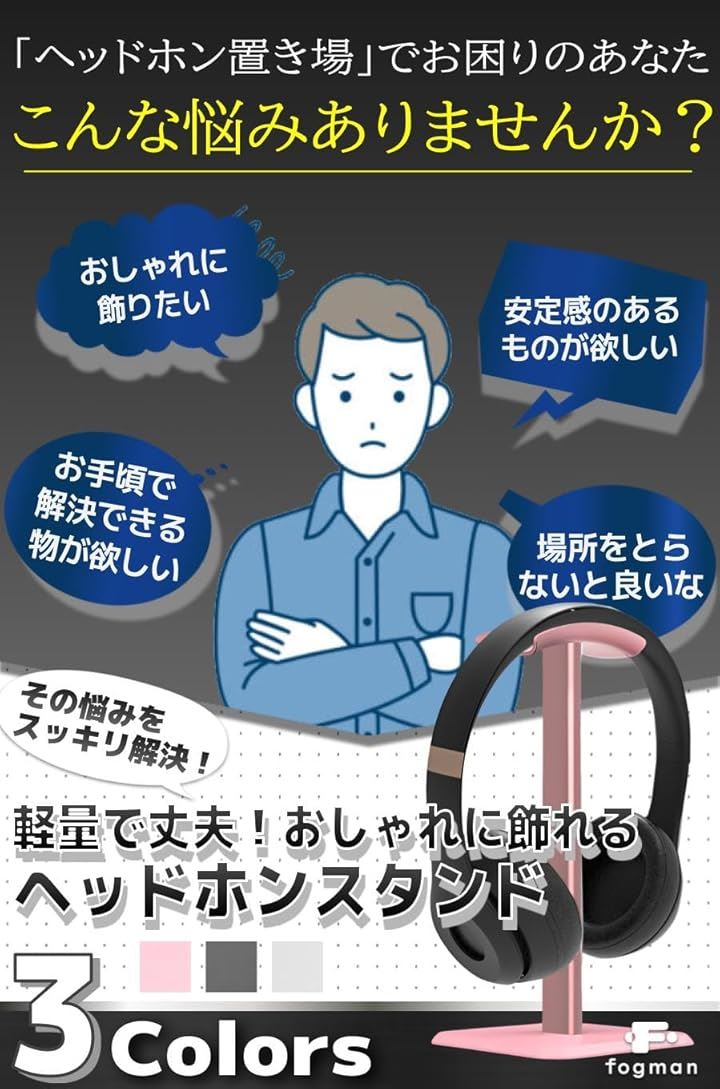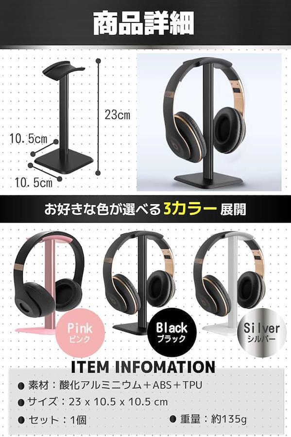 「商品特徴」(1)安定感のあるアーチ状:アーチ状なのでヘッドフォンがフィツト/(2)軽くて丈夫な素材:重みのあるヘッドフィンもしっかり支える/(3)シンプルなデザイン:場所をとらずインテリアにも馴染む/(4)カラーバリエーション:男女問わずに使いやすい色合い