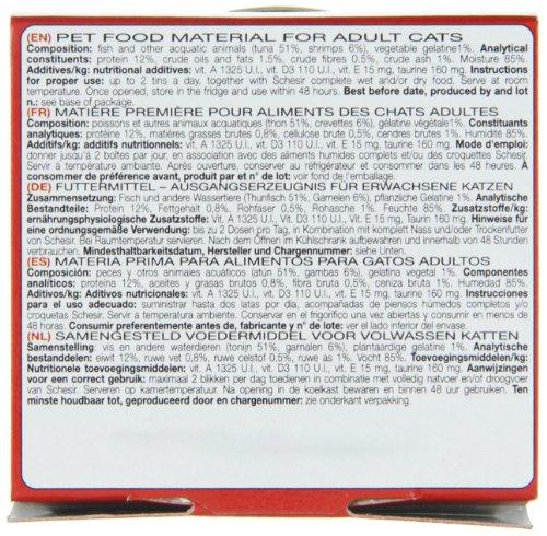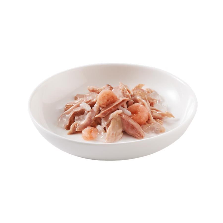 【原材料】ツナ51%※、エビ6%、ビタミンA1325IU、ビタミンE15mg、タウリン160mg※原材料のツナはロットにより(A)Euthynnus affinis:スマか(B)Katsuwonus pelamis:カツオです。【成分】粗たん白質12%、粗脂肪0.8%、粗繊維0.5%、粗灰分1%、水分85%【カロリー】51kcal/100g※自然素材を原料としている為メーカーより予告なく成分値等が変動することがあります。