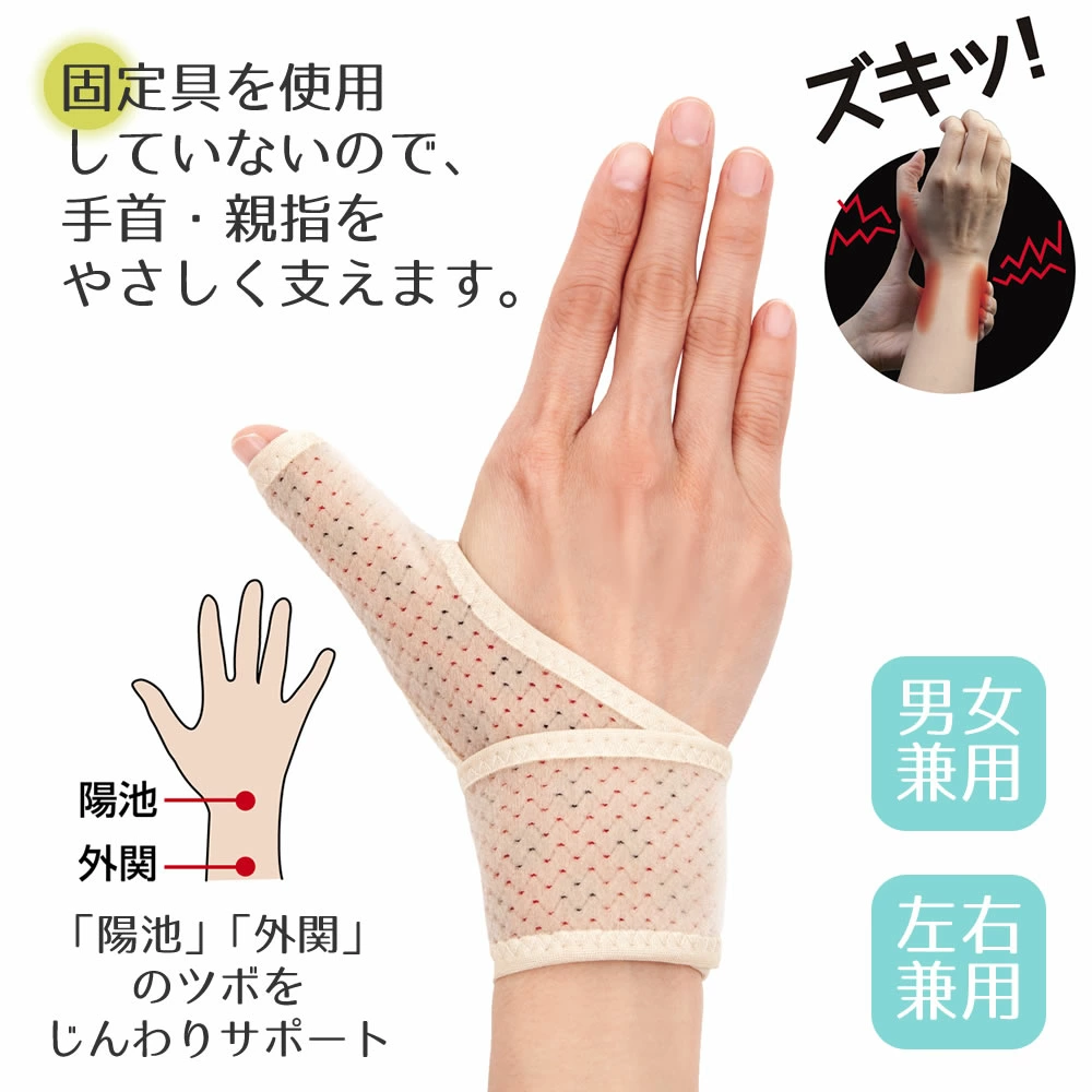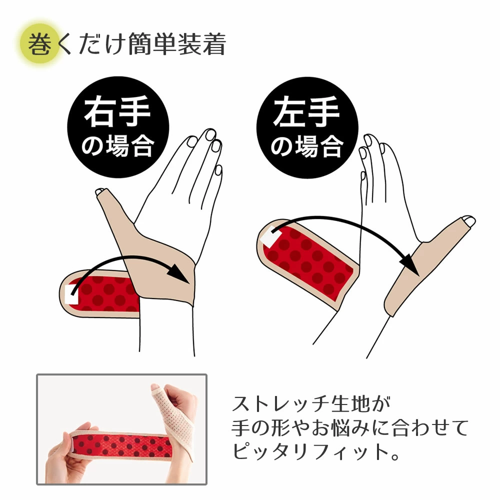 【商品情報】一日頑張った手首と親指に。やさしく支え、じんわり癒し。固定具を使用していないので、手首・親指をやさしく支えます。巻くだけ簡単装着ストレッチ生地が手の形やお悩みに合わせてピッタリフィット。生産国:日本製