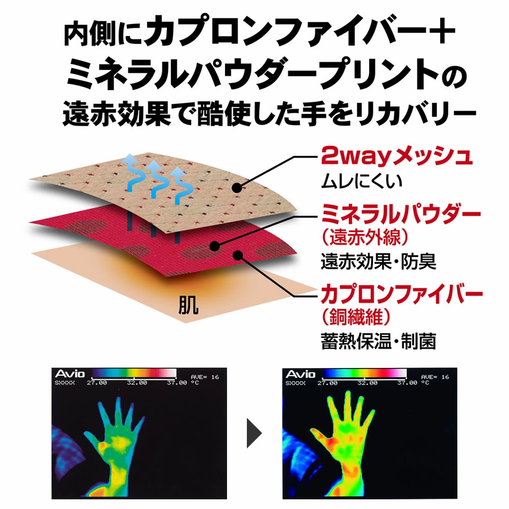 【材質】外面:ナイロン、ポリウレタン内面:ポリエステル、金属繊維、ポリウレタン
