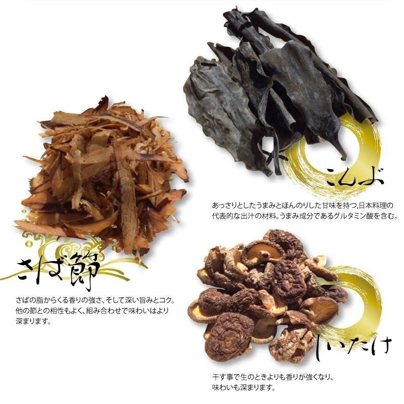 食塩(国内製造)、砂糖、さば削りぶし、うるめ削りぶし、かつおぶし、乾しいたけ、粉末しょうゆ、乾燥こんぶ、かつお・まぐろエキス、オニオン粉末、酵母エキス、(一部に小麦・さば・大豆を含む)