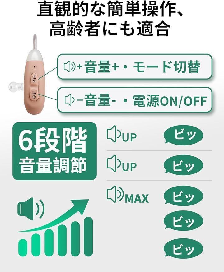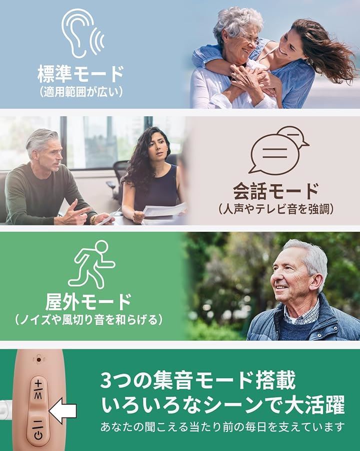 音量は6段階に調整可能.通常・会話・屋外3つのモード切り替えでき、自分の聞きやすい音量に調節できます。