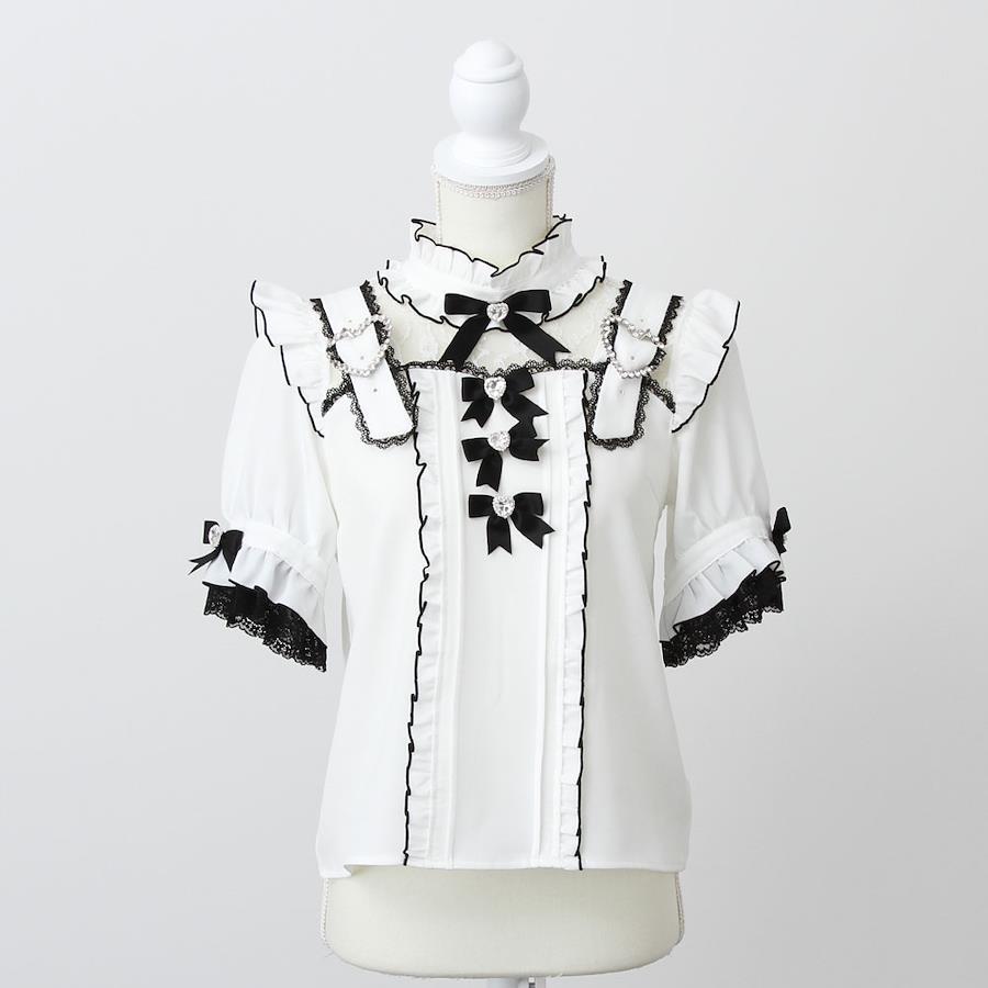 ハートバックルベルト付きビジューリボンたっぷり可愛いデザインブラウスが半袖になって登場♪</