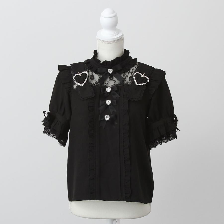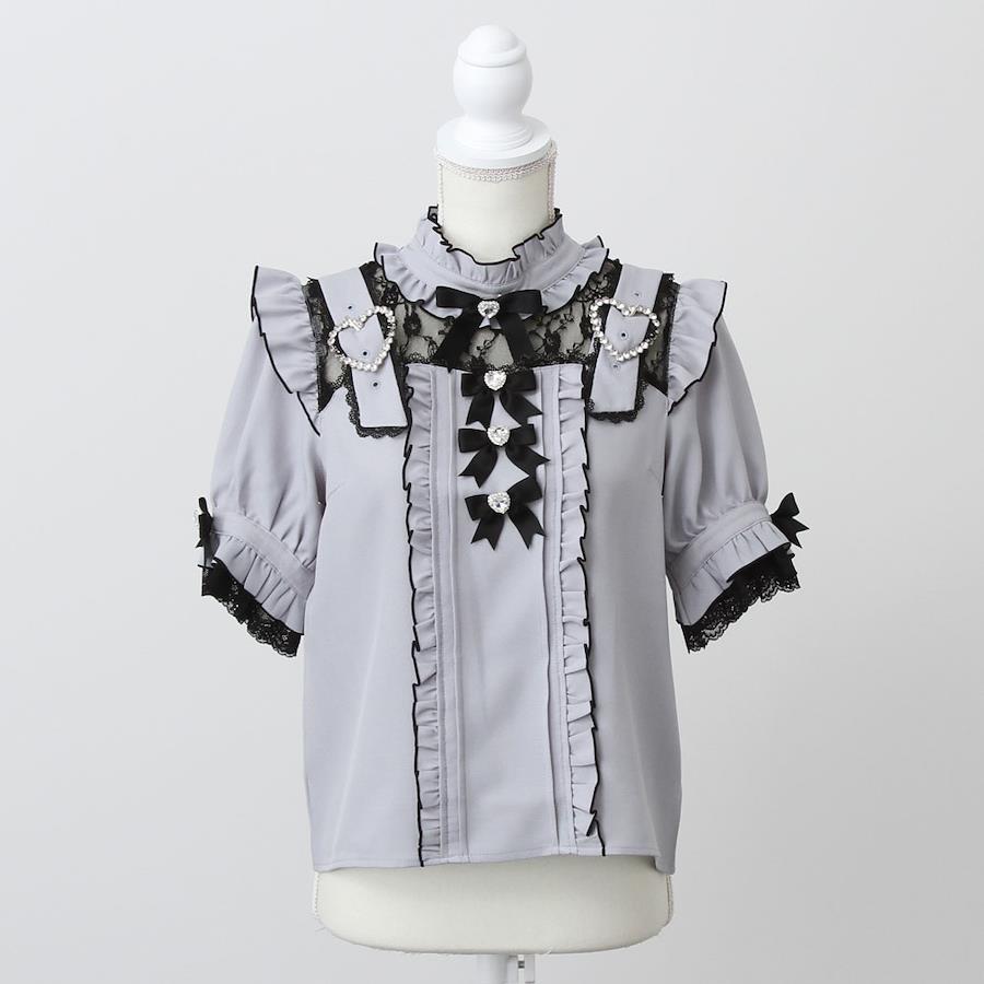 ハートバックルベルト付きビジューリボンたっぷり可愛いデザインブラウスが半袖になって登場♪</