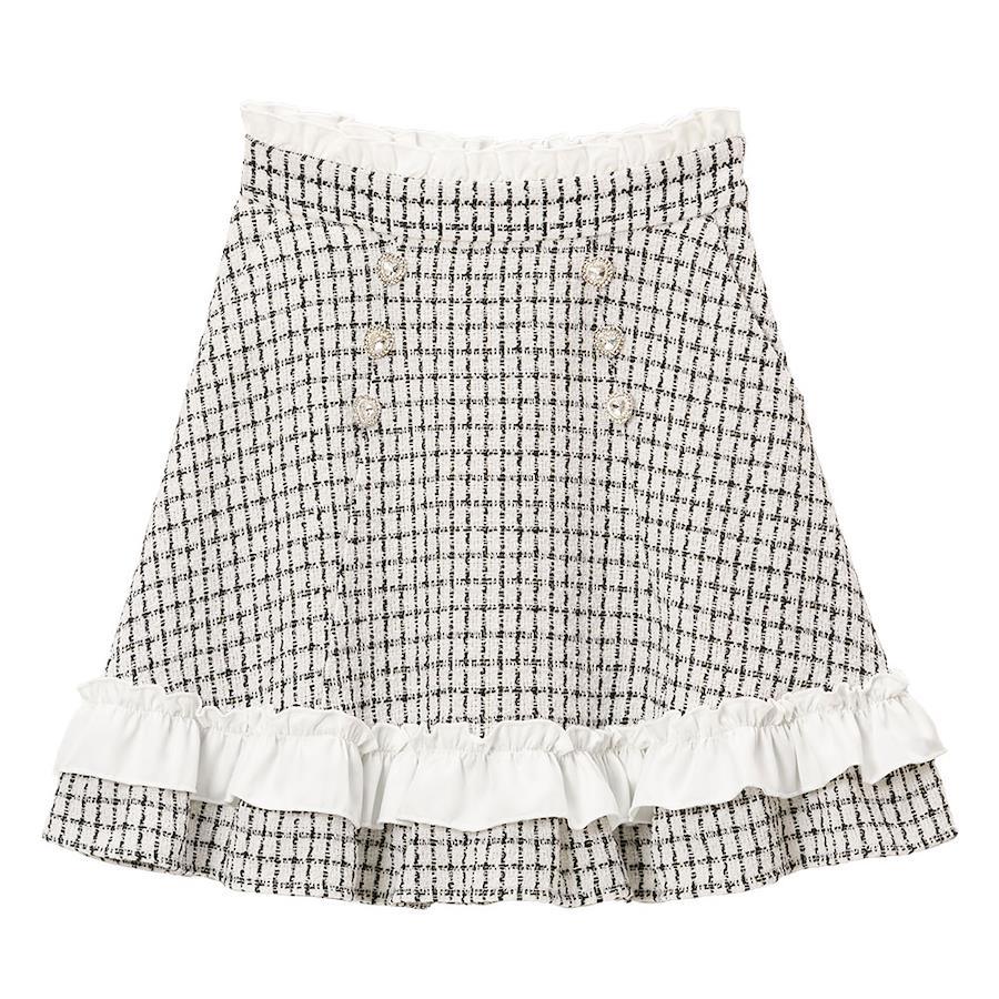 かわいいツイードチェック生地に、無地フリルがポイントのスカート
