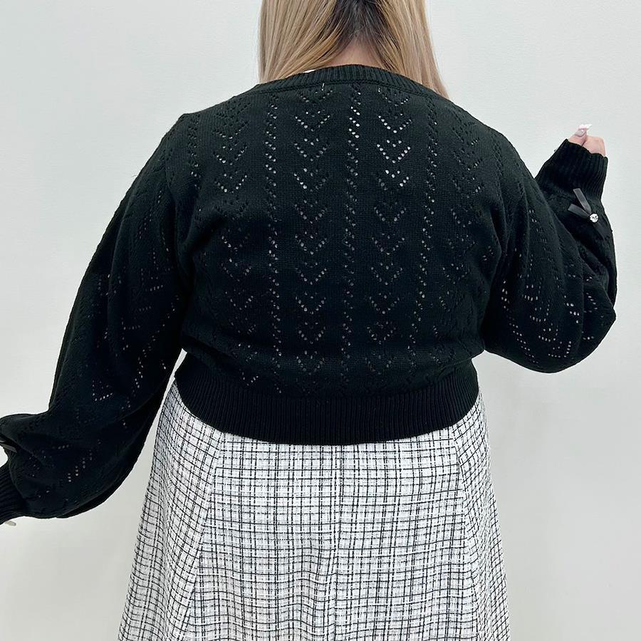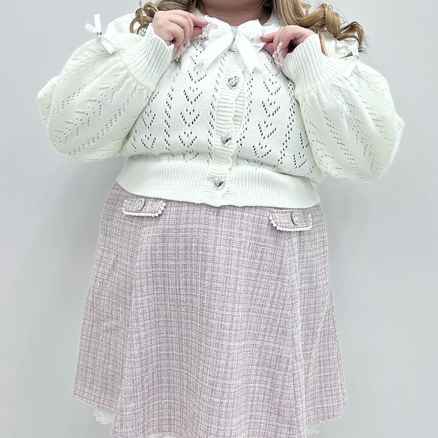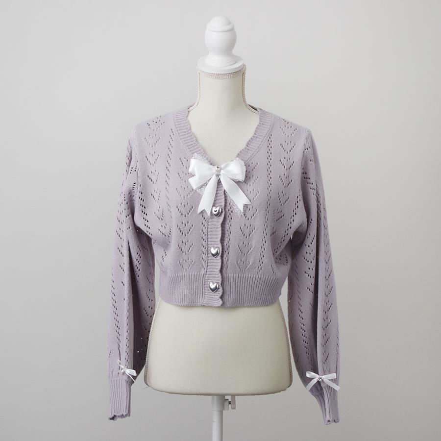 ときめくハート編地のかわいすぎるカーディガンが登場♪【デザイン】かわいいハートの編地の透かしカーディガンです♪ボリューム感のあるサイズ感でショートの丈感がスタイルをよく見せてくれます。カラーもかわいいカラーを沢山ご用意したので参戦服としても活躍してくれます♪前立てにはシルバーハートの立体ハートボタンとキラキラビジューのかわいいリボンがポイント♪コーデのワンポイントにもなるオススメのアイテムです。【素材】透かし編みのニットです。前のボタンで着脱可能です。前立てリボンは取り外しが可能です。【コーディネート】色々なコーデに合わせて着用できる万能カーディガンです。肌寒い季節や室内で羽織りたいときなどに活躍してくれます。ボリューム感があるのでどんなコーデにも羽織って頂けます♪《透け感》ややあり 《生地の厚さ》普通 《裏地》なし 《伸縮性》なし《生産国》中国