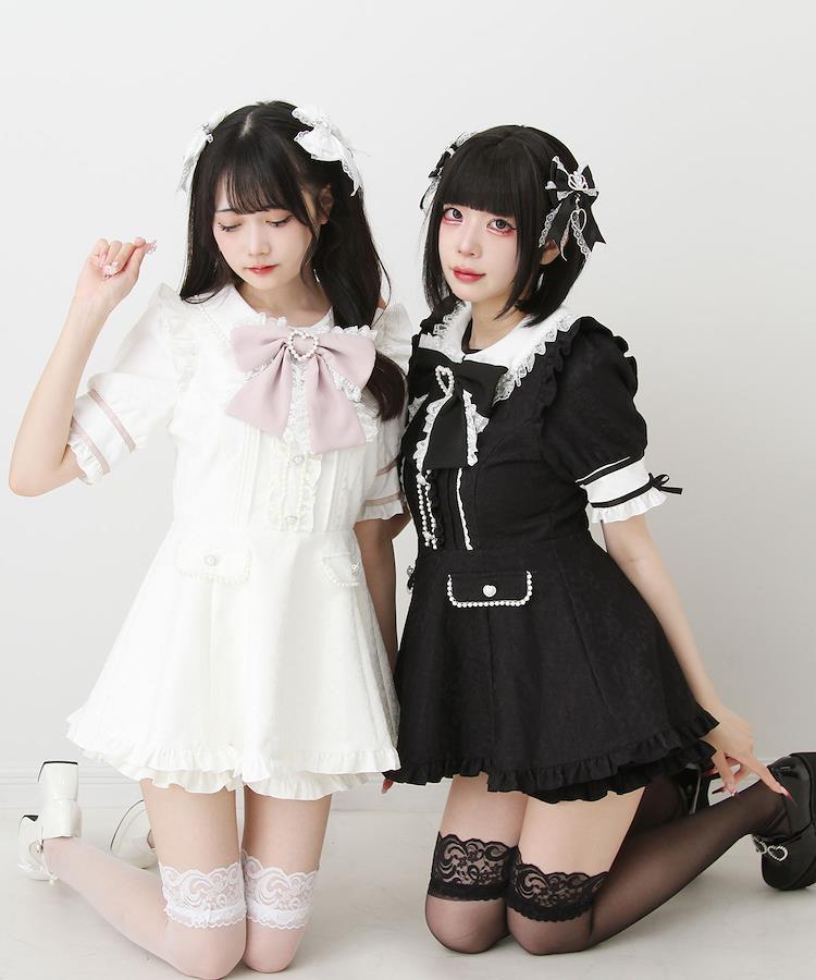 レース重ねデザインがかわいくパールとフリルを散りばめたセットアップです。