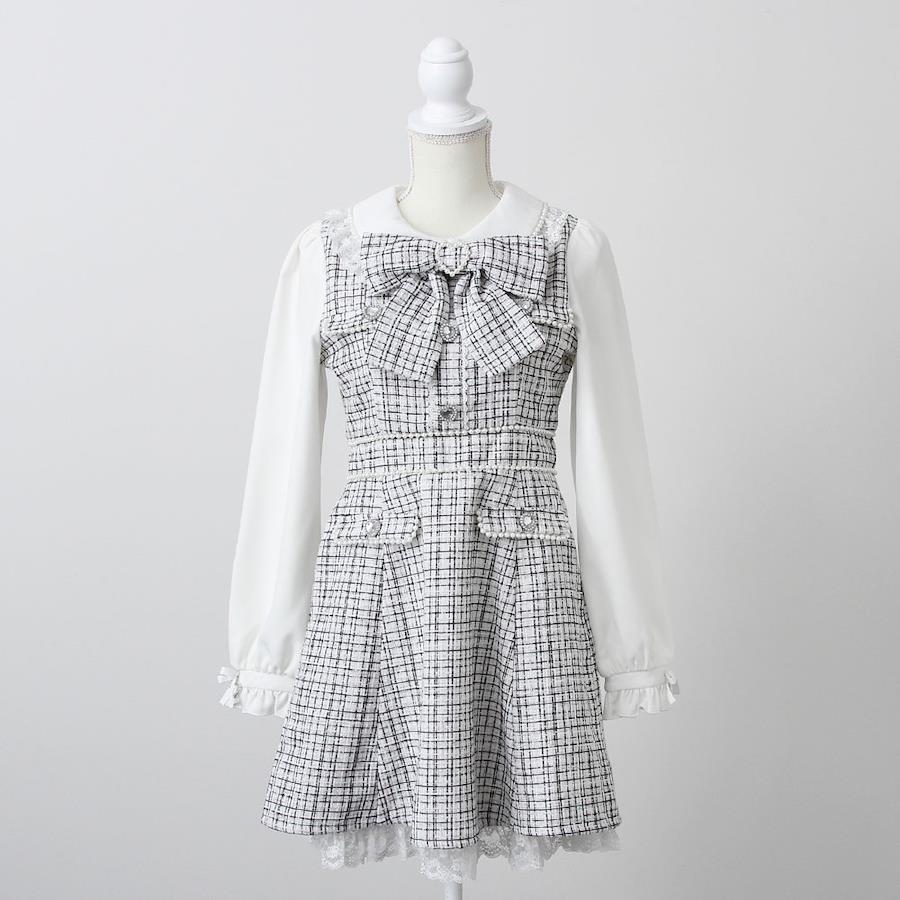 パールがあしらわれたツイードワンピースです。