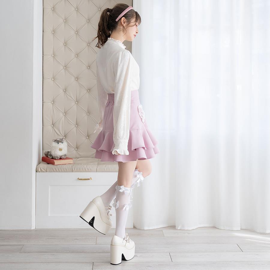 王道ガーリーなティアードフリルデザインスカートのご紹介。【デザイン】フロントのハートフリルポケットとレースアップデザインが甘くてガーリーなミニスカートです。腰回りはすっきりと見えるようにし、ティアードスカート部分はフリルが立体的でフワッと広がるように、メリハリのあるシルエットになるよう拘りました♪2つの素材で違った印象の4色のカラー展開になっています。ウエストの切り替え幅が広めなので、腰回りをすっきりと魅せてくれます。スカラップレースとパールボタンがコーデのアクセントに!後ろ中心ファスナーを開けて着脱する仕様です。後ろウエストはゴムになっているので、着心地が楽ちんなのもポイントです◎
