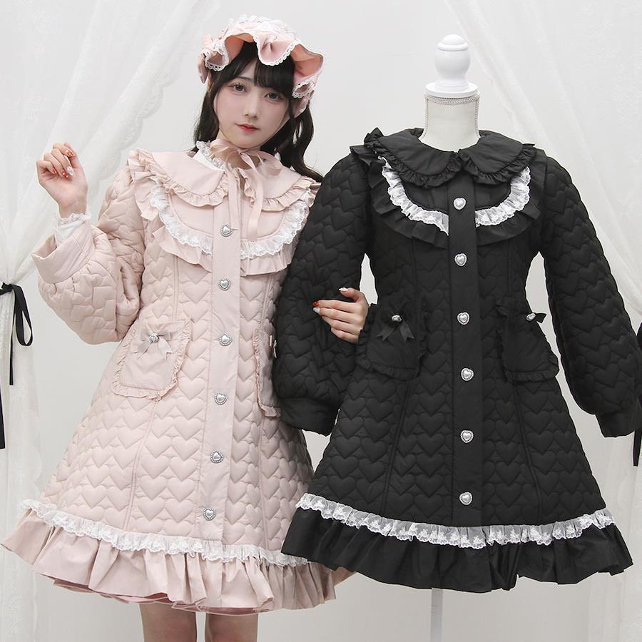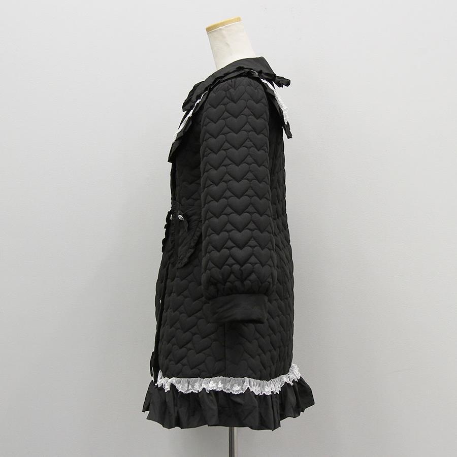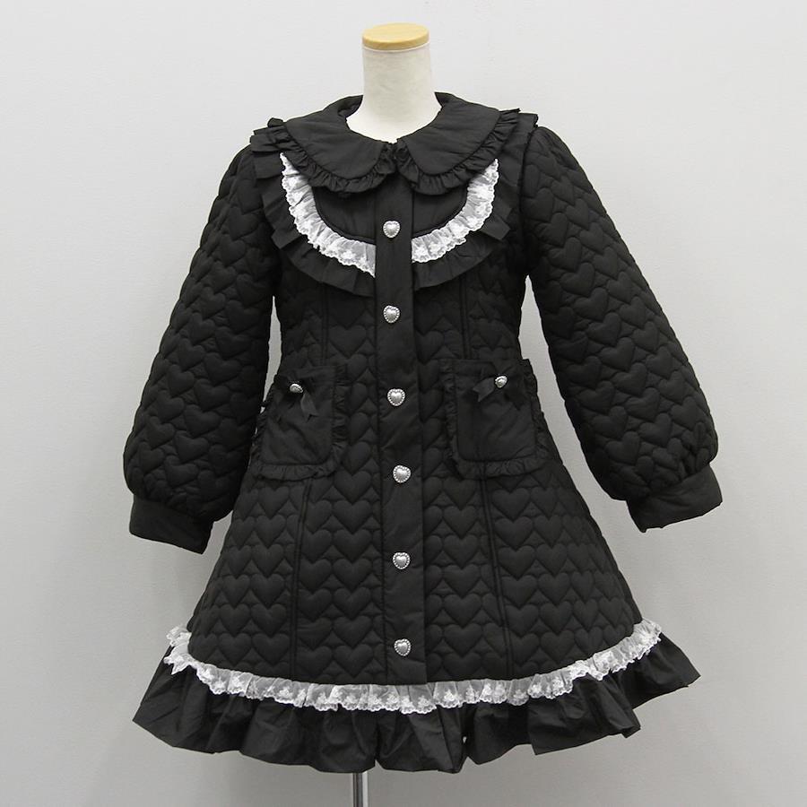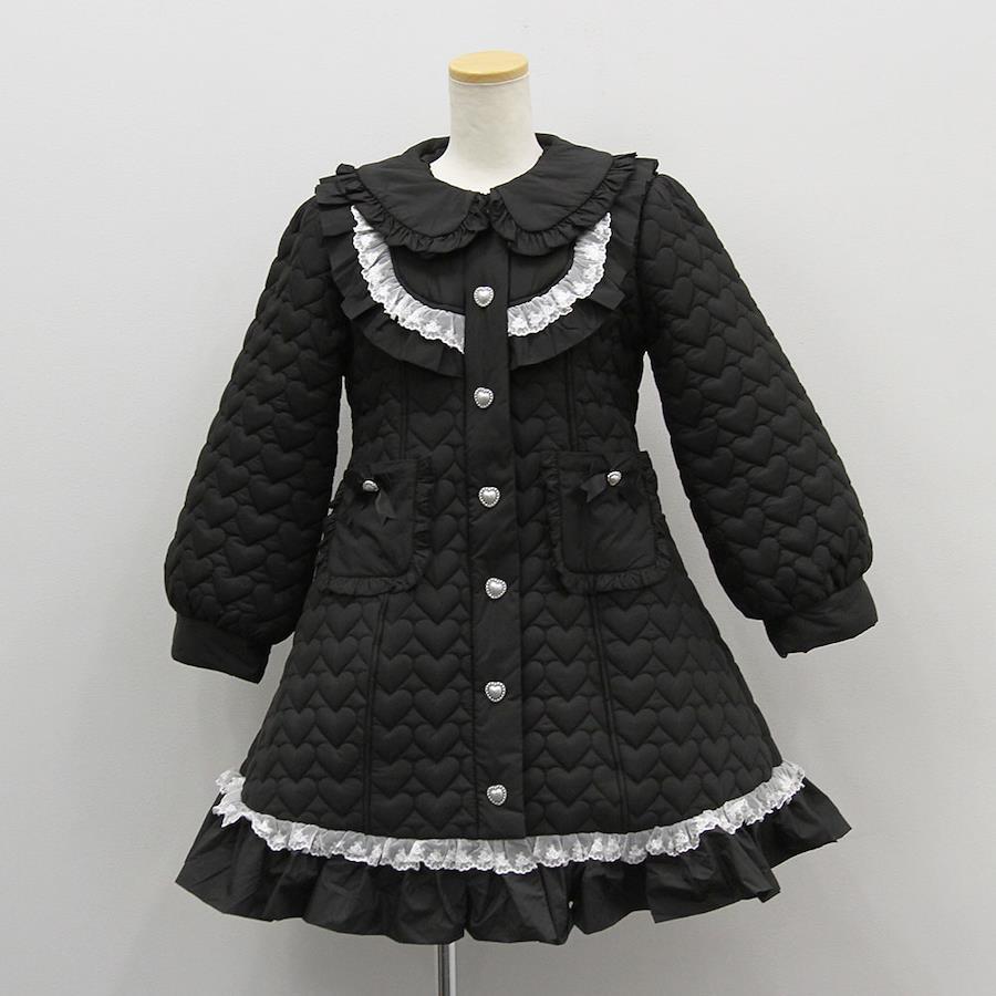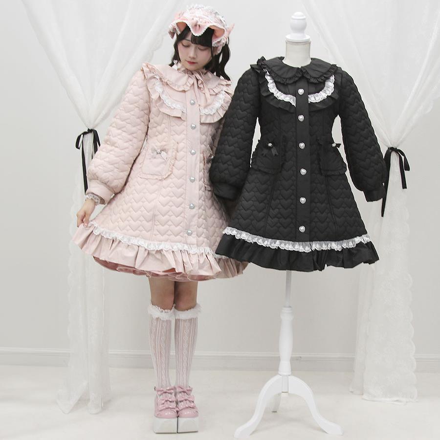 レースにフリルたっぷり、ときめきハートキルティングのドールコート【デザイン】ハートキルティングがかわいいEmilyのロリータ風コートが新登場♪ヨークデザインがかわいくレースとフリルがあしらわれています。ハートパールボタンがかわいく、着用時はスナップ釦でとめ、ファスナーがあるので楽ちんに着られます。リボンやレースたっぷりのかわいいコート1枚でお人形さんに変身できちゃうアイテムです!【素材】ハートキルティングに中綿が入っています。暖かくボリュームのある生地感になっています。【コーディネート】どんなお洋服にも合わせやすくボリュームがあるので、ふんわり広がるアイテムも着用して頂けます。1枚で暖かくかわいくコーデできるのはこのコートだけ♪かわいいパンプスやヘッドドレスでかわいくコーデしましょう♪《透け感》なし 《生地の厚さ》厚手 《裏地》あり 《伸縮性》なし《生産国》中国
