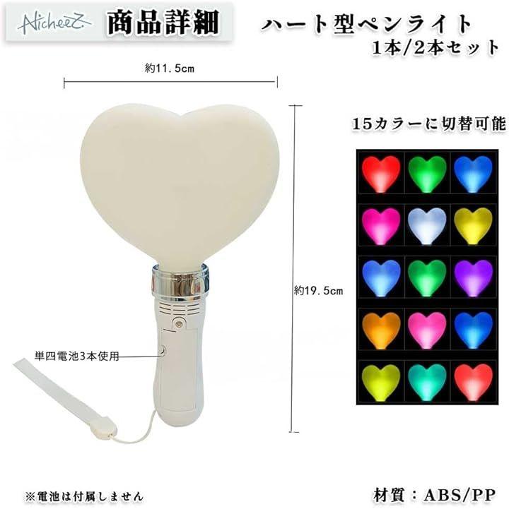 「商品内容」ハート型ペンライト1本/2本セット 材質:ABS/PP カラー:15カラー切替点灯 サイズ:縦/約19.5cm 横/約11.5cm 単4電池3本使用 *電池は付属しません