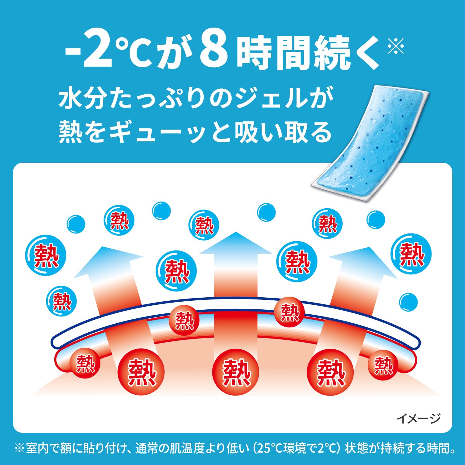 熱さまシートに含まれるたっぷりの水分が熱を吸って蒸発するので、約8時間後でも変わらず肌の温度を-2℃冷やし続けます。