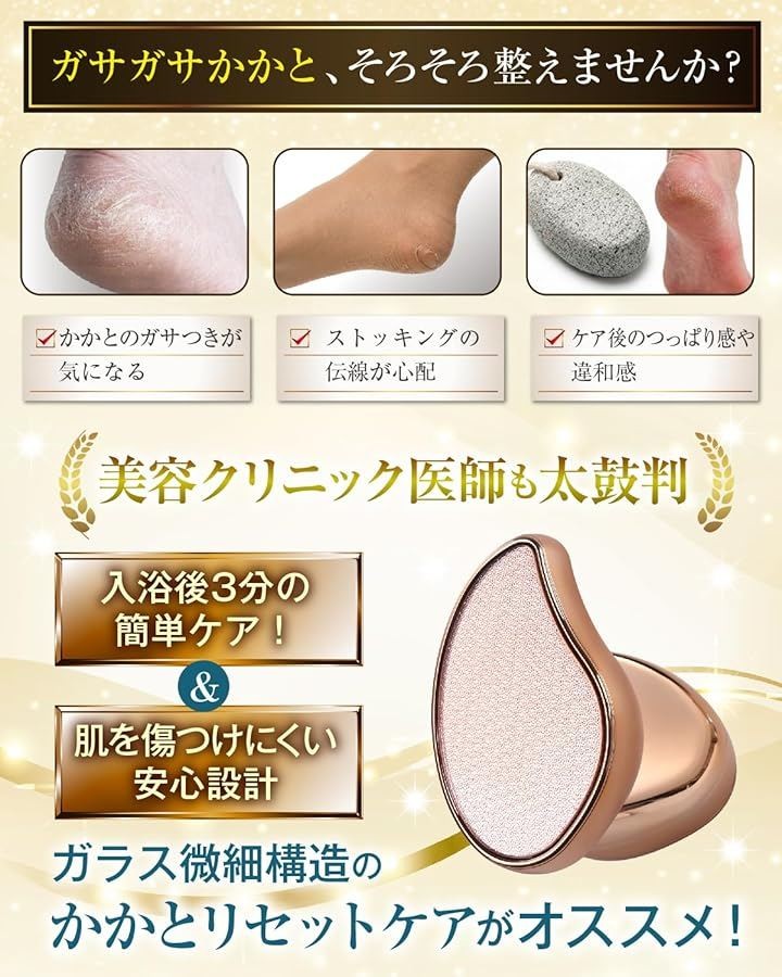 「かかとケアの悩みに」 かかとのガサつき、ストッキングが引っかかる不快感、素足を見せる季節の不安など、かかとケアのよくある悩みに向けた一品です。