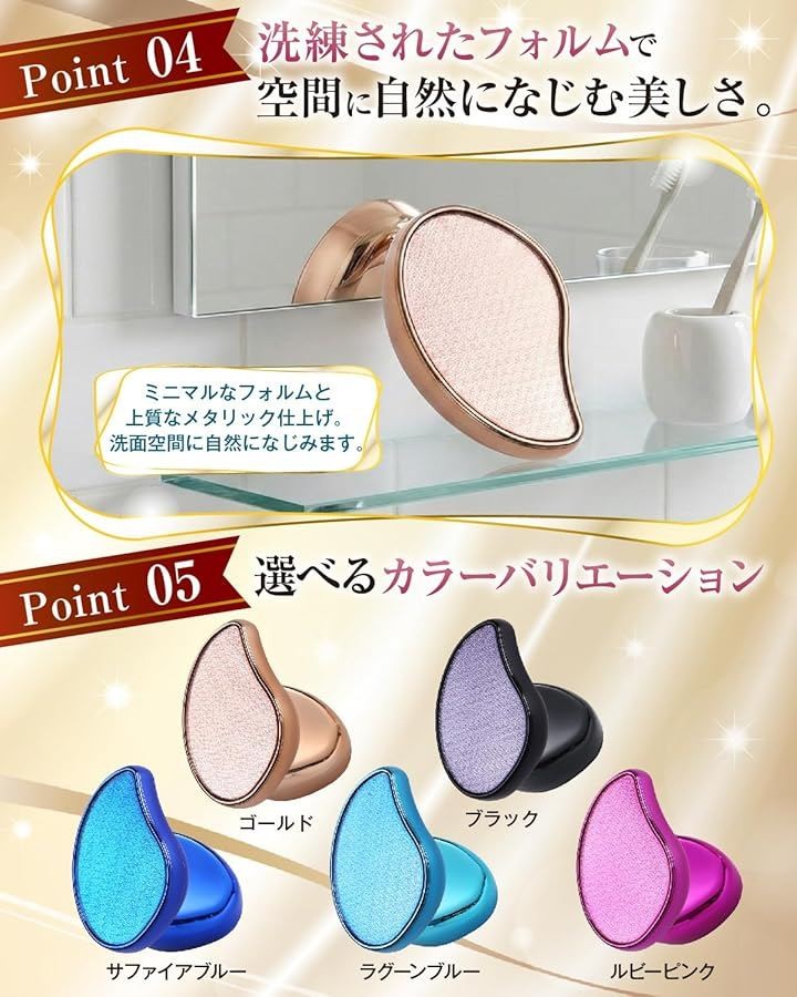 ミニマルなフォルムと上質なメタリック仕上げで、洗面台やバスルームにも自然になじみます。