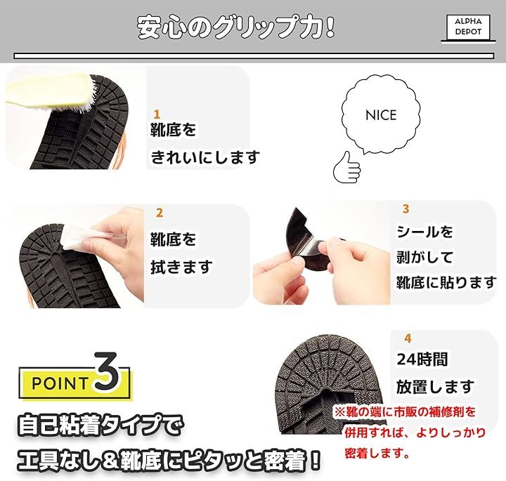 「製品仕様」貼付方法:(1) 靴底の汚れを拭き取ります (2) 乾燥のため5分ほどお待ちください (3) 位置を合わせて貼り付けます (4) 空気を抜きながら圧着します (5) 体重をかけてしっかり固定します (6) 貼付後は24時間放置してください 補足:取り外す際はドライヤーで温めると剥がしやすく、跡も残りにくくなります。