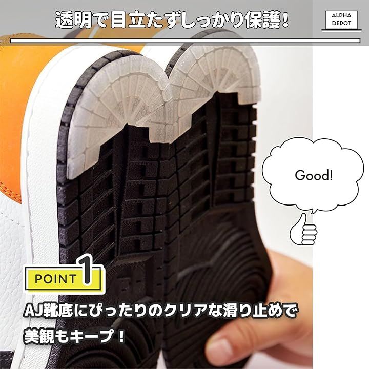 「透明だから目立たず安心。」AJスニーカー専用カット設計の透明シートだから外観を損なわず、ソール部分を自然に保護できます。