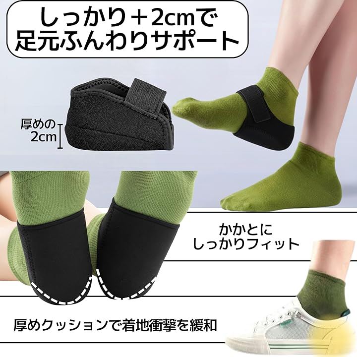 「仕様」 サイズ:L(約25.5~27.5cm) 外形(本体):約 長12.5 x 幅7 x 高8cm/生地部厚み 約0.35 cm かかと高さ:+2cm 素材:シリコンパッド芯、SBR、起毛ニット(面ファスナー受け側)、弾性ストラップ カラー:ブラック 装着:左右どちらにも装着可(左右1ペア)/面ファスナーで調整 適合目安:スニーカー・ワークシューズ等(革靴は薄手ソックス推奨) お手入れ:手洗い、陰干し *医療的効能を保証する製品ではありません。