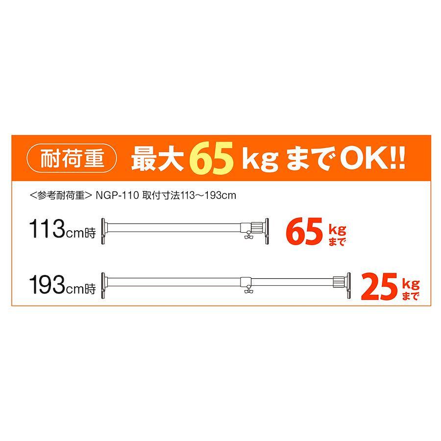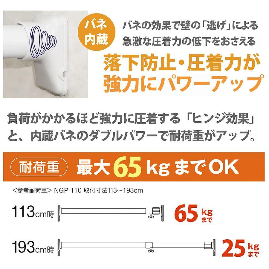 3営業日以内に発送≪新品未開封品≫:【サイズ】幅113~193×高11×奥行7.6cm【取付幅】113~193cm【パイプ径】3.4cm/【耐荷重】113cm時 65kgまで / 193cm時 25kgまで【本体重量】1.2kg【カラー】ホワイト/【材質】〈パイプ〉鉄・エポキシ樹脂粉体塗装〈樹脂部品〉ABS樹脂、合成ゴム〈金具類〉鉄・メッキ仕上げ/強力ジャッキで圧着固定。ばね内蔵で取り付けやすい。/耐荷重最大65kgで部屋干しや洋服掛けとしてもたくさん掛けられる超強力タイプ。バッグやスーツなども安心して掛けられる。