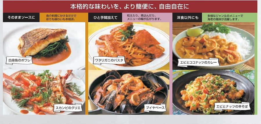 バターやトマトペースト等でコクをつけた甲殻類の旨み豊かなアメリカンソースです。マイルドな味付けは、魚料理に幅広く利用できます。パスタ・グラタン・リゾットなどにおすすめ