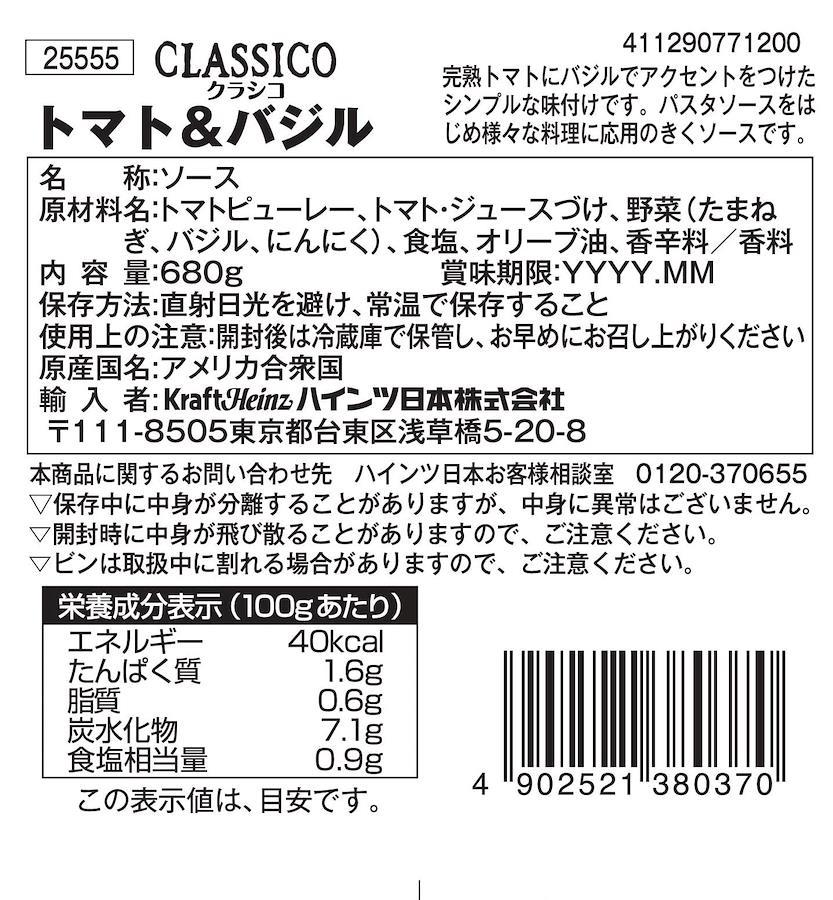 内容量:680g瓶入りトマトソース パスタソース完熟トマトとバジルのシンプルなソース原産国:アメリカブラント名: ハインツ クラシコ【重要】メーカーによる商品リニューアルに伴いパッケージ(内容量も含む)変更が行われた場合、新パッケージでお届け致します事ご了承願います。