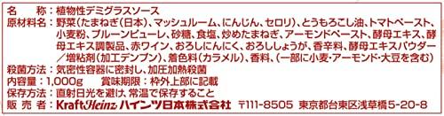 野菜(たまねぎ(日本)、マッシュルーム、にんじん、セロリ)、とうもろこし油、トマトペースト、小麦粉、プルーンピューレ、砂糖、食塩、炒めたまねぎ、アーモンドペースト、酵母エキス、酵母エキス調製品、赤ワイン、おろしにんにく、おろししょうが、香辛料、酵母エキスパウダー/増粘剤(加工デンプン)、着色料(カラメル)、香料、(一部に小麦・アーモンド・大豆を含む)