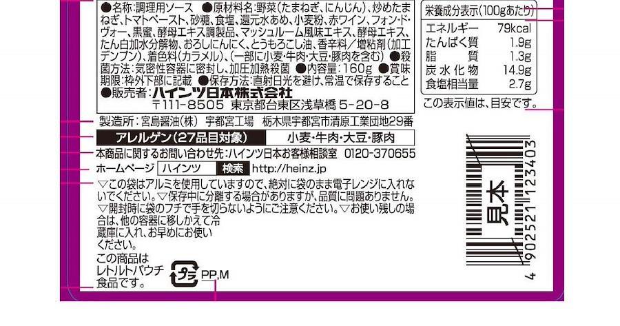 野菜(たまねぎ、にんじん)、炒めたまねぎ、トマトペースト、砂糖、食塩、還元水あめ、小麦粉、赤ワイン、フォン・ド・ヴォー、黒蜜、酵母エキス調製品、マッシュルーム風味エキス、酵母エキス、たん白加水分解物、おろしにんにく、とうもろこし油、香辛料/増粘剤(加工デンプン)、着色料(カラメル)、(一部に小麦・牛肉・大豆・豚肉を含む