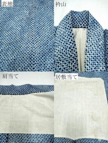 衿山に薄い汚れ、表地所々・肩当て・居敷当てに薄いシミがございます。