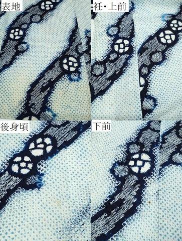 状態は接写画像のように表地にヤケ、衽・上前・後身頃・下前に薄い汚れがございますが