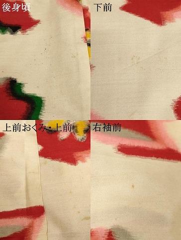 着物【正絹】の状態は接写画像のように後身頃・下前・上前おくみ・上前・右袖前に汚れがございますが