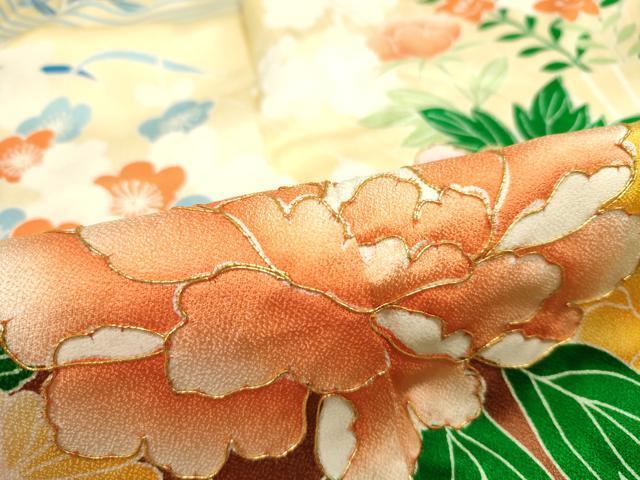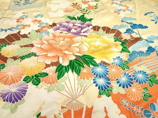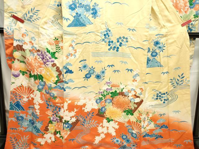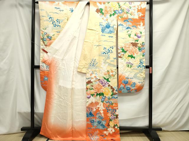 Heiwa-ya Kimono ■ Gorgeous Furisode Kimono with Koma Embroidery, Fan-Shaped Floral Pattern, Gradient Dyeing, Pure Silk, Excellent Item, DAAW6786ob