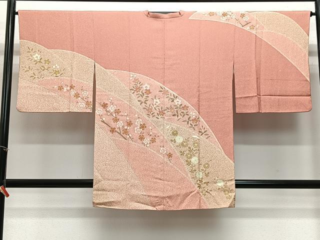 Heiwa-ya Kimono ■ Michiyuki Coat, Floral Pattern, Gradient Dye, Gold Accents, with Hem, Pure Silk, Excellent Condition, CABA3326ua